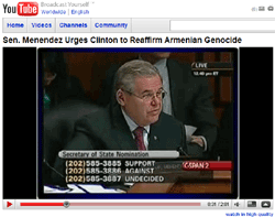 WASHINGTON, DC - Speaking today during the nationally televised Senate Foreign Relations Committee confirmation hearing for the incoming Secretary of State, Sen. Bob Menendez (D-NJ) praised Hillary Clinton's long record of support for Armenian Genocide recognition and urged her to continue her principled stand on this core human rights issue as the nation's top diplomat, reported the Armenian National Committee of America (ANCA).